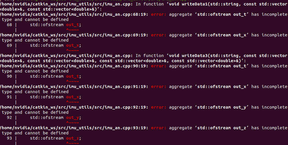 /home/nvidia/catkin_ws/src/imu_utils/src/imu_an.cpp:68:19: error: aggregate 'std::ofstream out_t' has incomplete type and cannot be defined