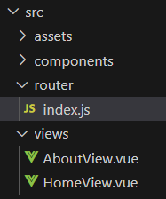 可以发现,创建的代码自带router/index.js、views/HomeView.vue和AboutView.vue文件: