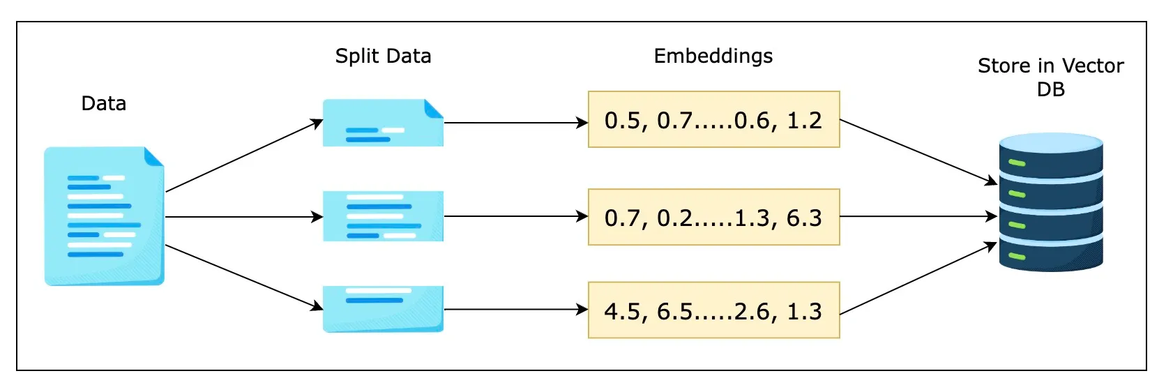 - 嵌入: 将数据块Chunk使用一些嵌入模型转换为高纬度的词向量表示,用于表示语义关系和文本相似性以便大模型可以理解