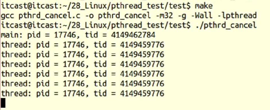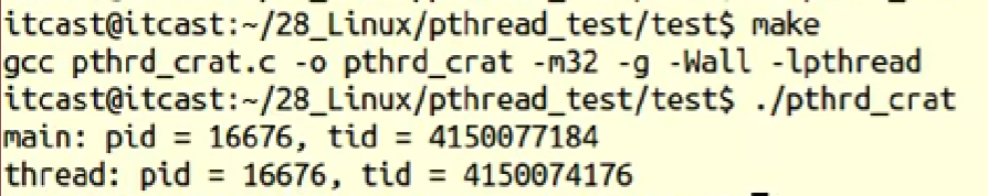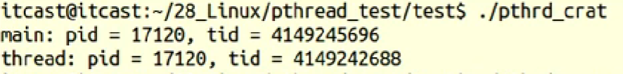 printf("thread: pid = %d, tid = %lu\n", getpid(), pthread_self());