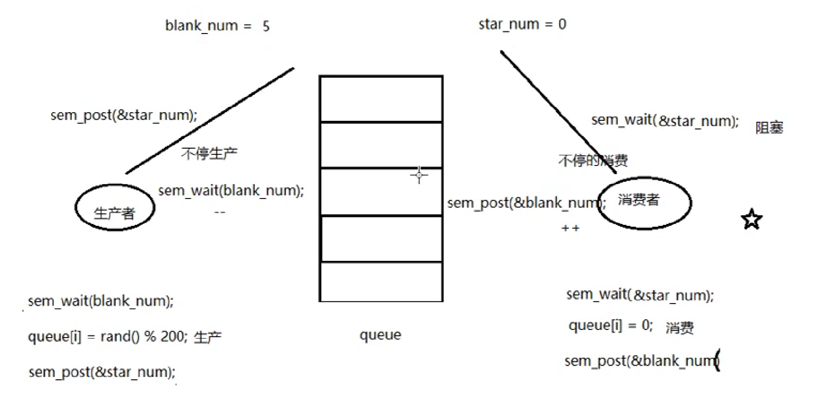 sem_wait(&blank_number); // 生产者将空格子数--,为0则阻塞等待