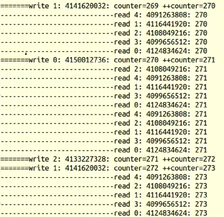printf("=======write %d: %lu: counter=%d ++counter=%d\n", i, pthread_self(), t, ++counter);