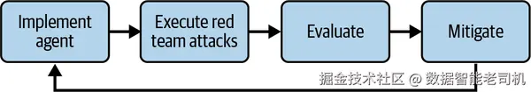 图 12-1 展示了代理系统红队的迭代生命周期:从最初实现,到攻击执行、评估与缓解,并通过反馈回路不断强化。
