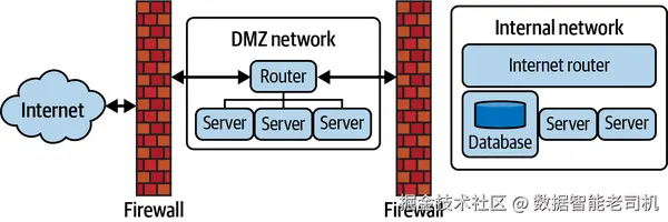 采用 DMZ 将对外组件与内部敏感资源隔离(见 图 12-3 ),在互联网--->DMZ--->内网的链路上通过防火墙、路由与分段网络过滤流量。进一步细分子网 (如 Web 与数据库分离),并在内部路由上配置 ACL 与监控,配合 mTLS 实施零信任式的细粒度策略,限制横向移动与协议/端口范围。