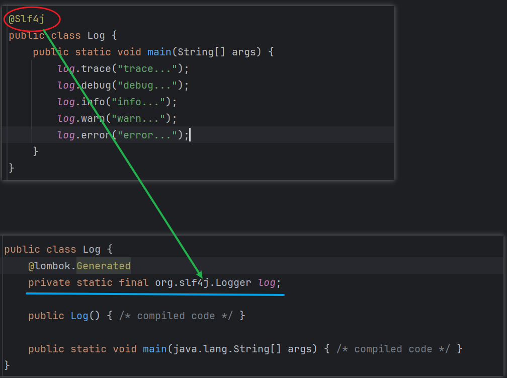 通过lombok中提供的@Slf4j注解,可以简化定义日志记录对象Logger的这步操作。 添加了该注解,就相当于在类中定义了日志记录对象Logger:private static final Logger log = LoggerFactory. getLogger(Xxx. class);