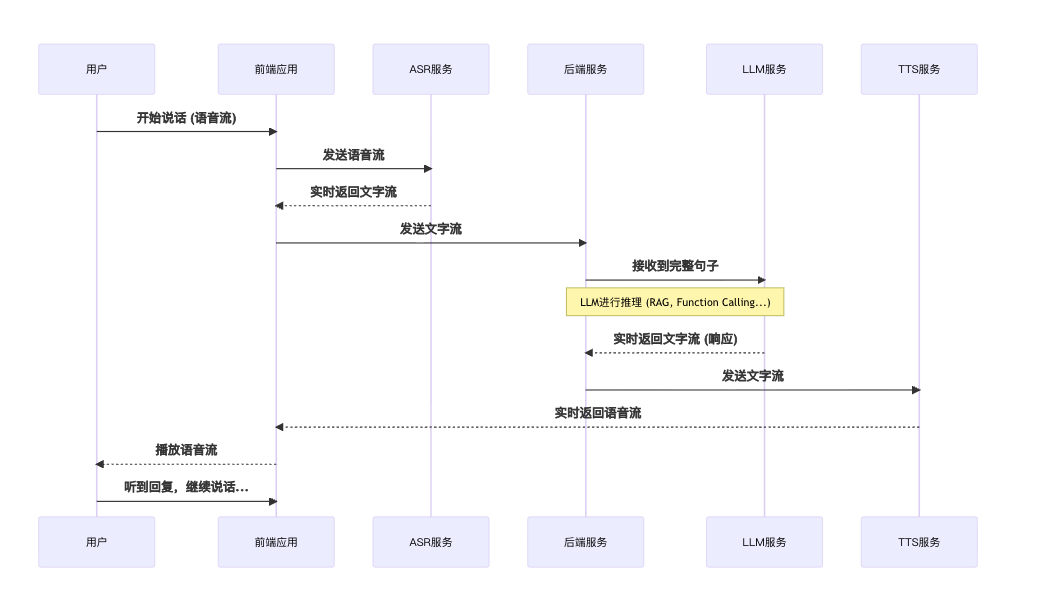 - 这个流程强调了流式处理的重要性。LLM 在收到用户完整句子后开始推理,而 TTS 在收到 LLM 的第一个词后就可以开始生成语音并播放,这极大地减少了用户等待时间。