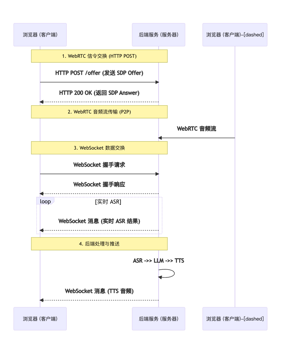 - 数据流推送: 通过 WebSocket,将处理后的 ASR 文本和 TTS 音频主动推送给前端。