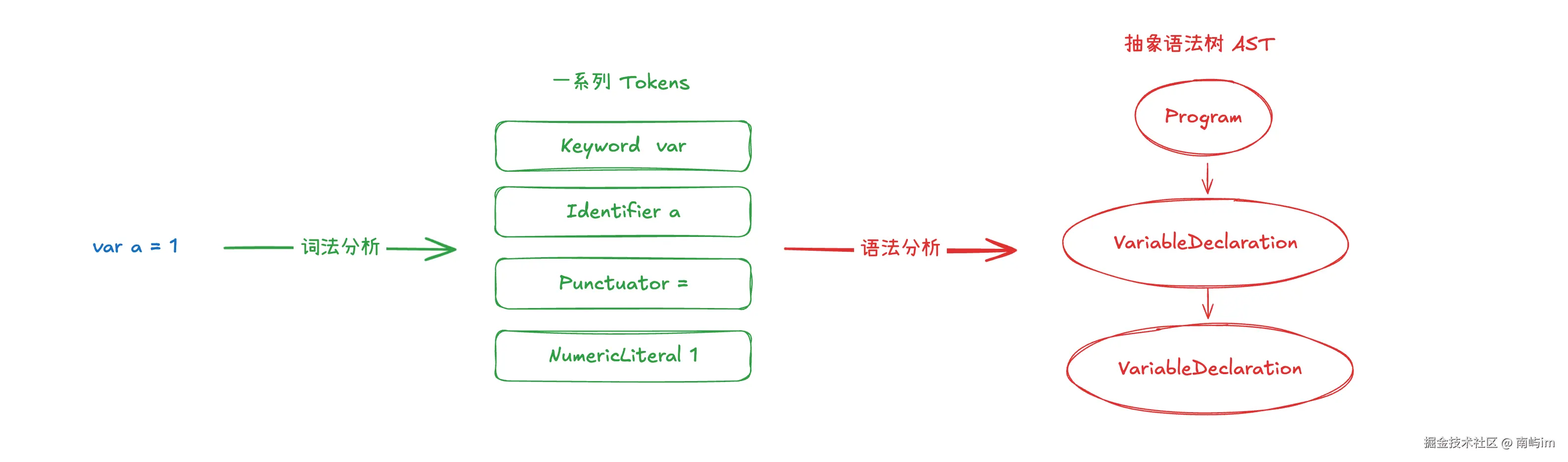 从字符串到解析出抽象语法树,中间会经历两个步骤:词法分析(Lexical Analysis)和语法分析(Syntax Analysis)。