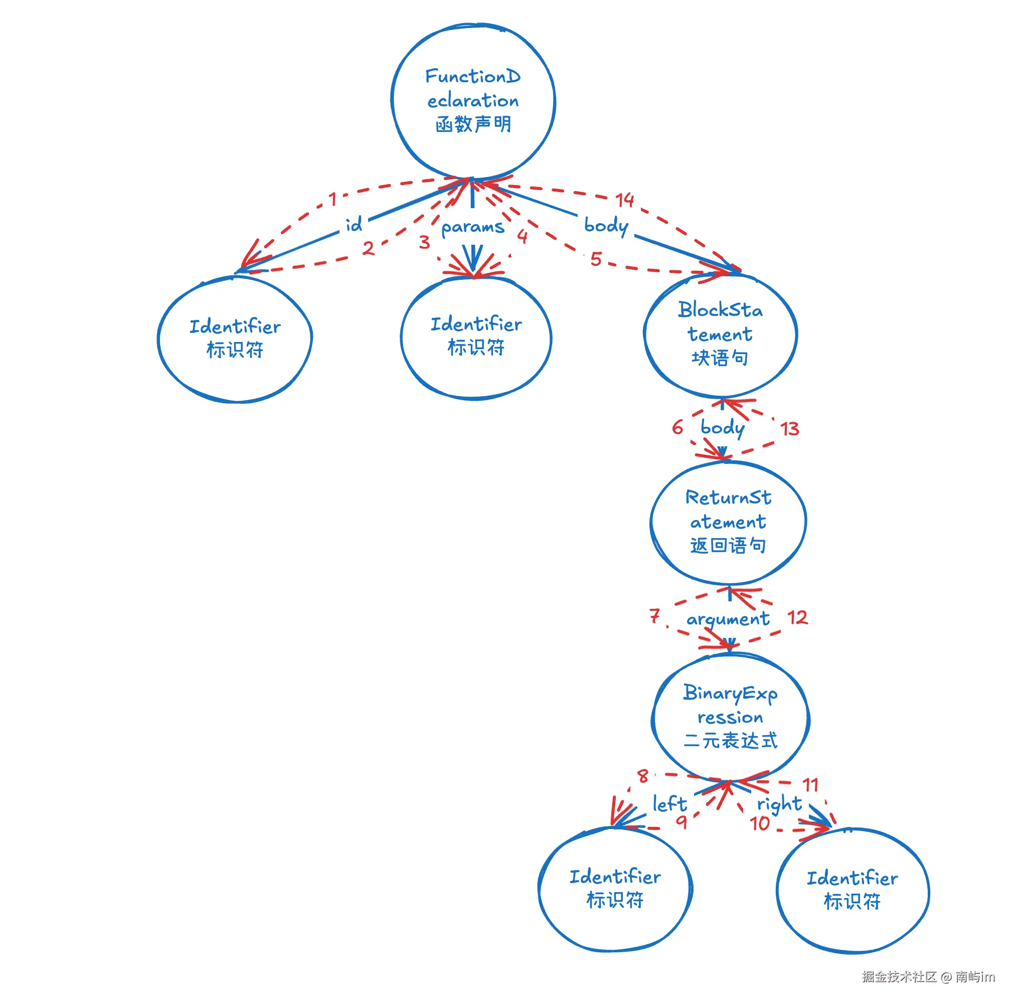 所以遍历 AST 的过程,就是沿着这些属性(边),不断访问子节点(顶点),直到走遍整棵树。