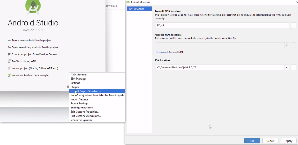 SDK的选项android-30 30.0.3(29.0.2自动下载) ndk21.4(r21e)。