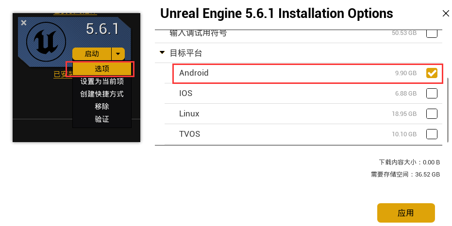 安装EpicInstaller虚幻启动器,然后安装对应引擎版本例如UE5.6,再添加Android目标平台,否则无法打包安卓。
