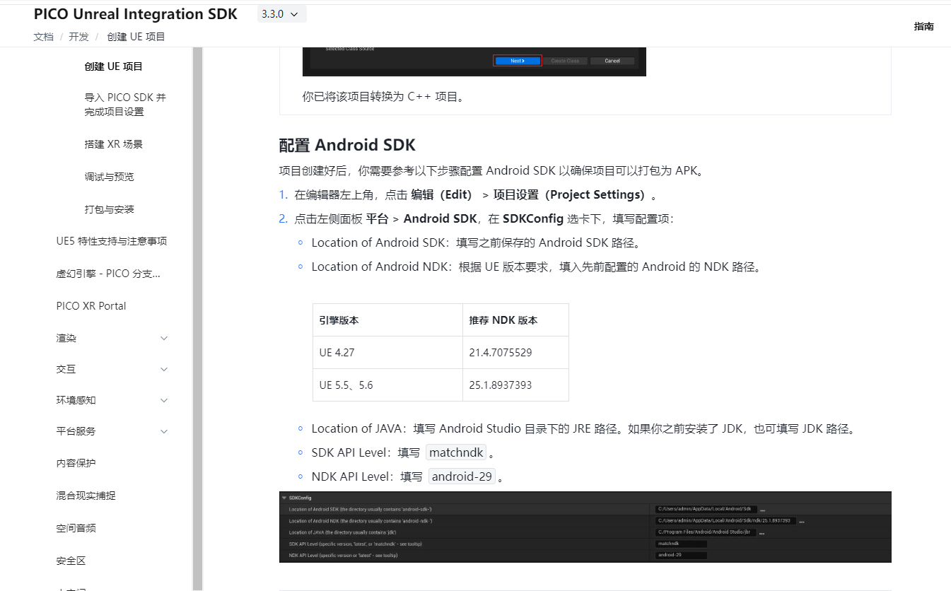 Pico 开发文档的Android环境设置,截图中以UE5.4为参考。