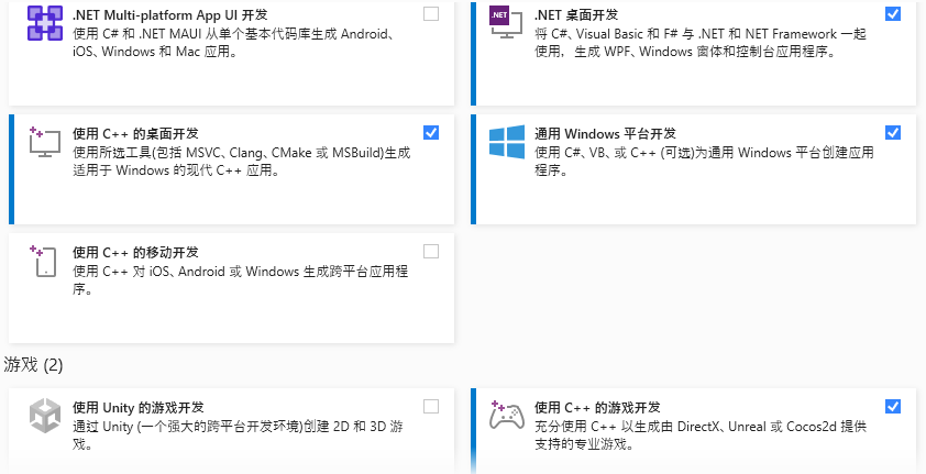 勾选4小项目: .net桌面开发、使用C++桌面开发、通过Window平台开发、使用C++的游戏开发