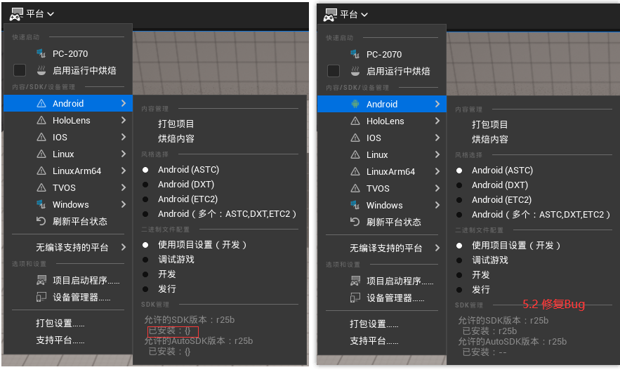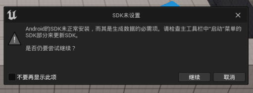 UE5.1未识别到系统环境的ndk r25b 25.1.8937393 ,打包时弹出警告如下,忽略弹窗继续执行。 5.2修复该Bug