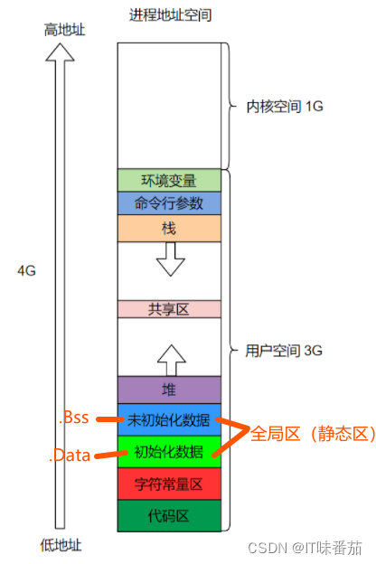 以32位系统为例,共有4G的寻址能力,进程在内存中的分布如下图所示。Linux默认将高地址的1G空间分配给内核,称为内核空间,剩下的3G空间分配给进程使用,称为用户空间。
