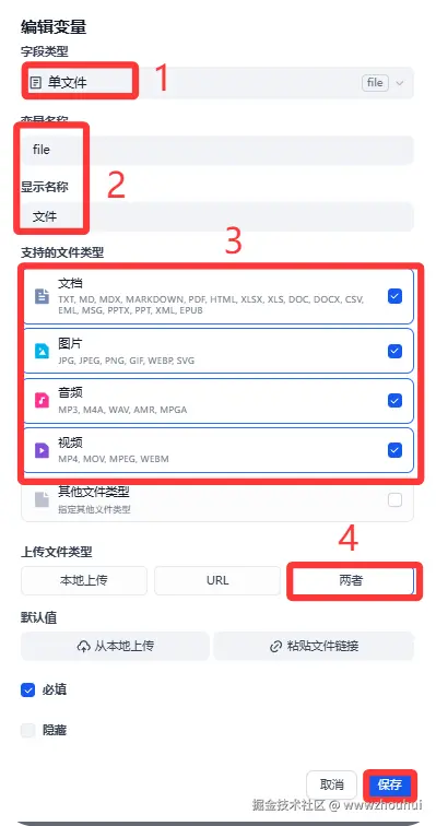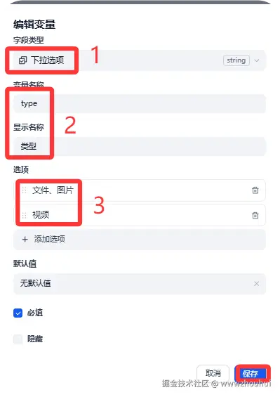 另外的type类型我们这里设置下拉选项1个支持 文件、图片 2 视频