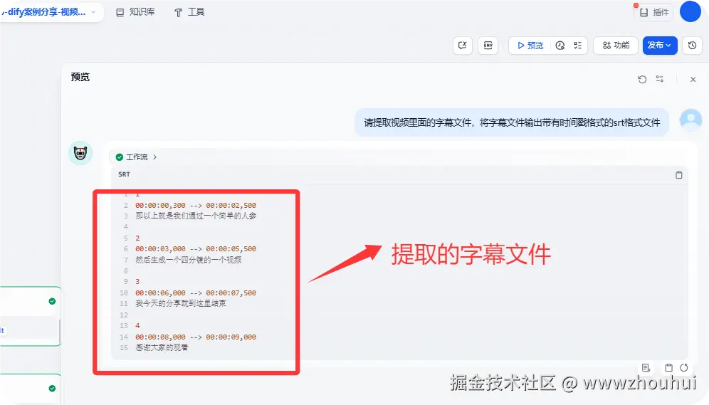 上面显示提取了带有时间戳格式的srt格式文件,当然后面如果想把这个字幕文件直接保存srt格式文件 也是可以的可以借助第三方工具在把文本内容转成.txt格式文件提供下载(感兴趣的小伙伴可以在我上面提供工作流上扩展)
