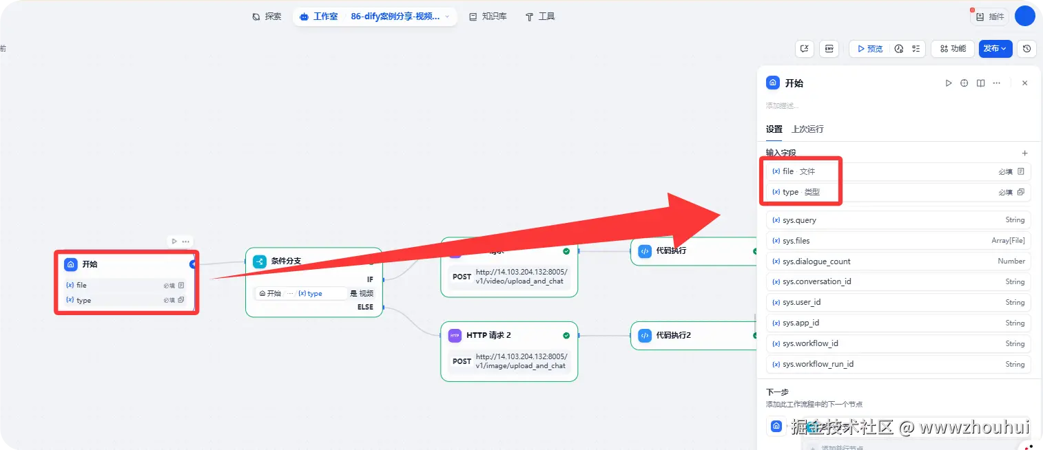 开始节点中我们设置2个参数,一个是file 文件。1个是type 类型。