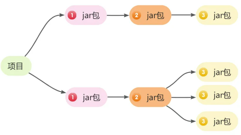 假设项目A依赖项目B,项目B依赖项目C,则A----->直接依赖B,B----->直接依赖C,A----->间接依赖C。直接依赖和间接依赖是一个相对的概念。直接在项目中配置的依赖称为直接依赖,通过添加依赖关联进来的依赖称为间接依赖。1是项目的直接依赖,2是1的直接依赖,2是项目的间接依赖,以此类推。如图