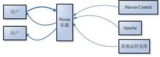 私服是一种特殊的远程仓库,它是架设在局域网内的仓库服务,私服代理广域网上的远程仓库,供局域网内的Maven用户使用。当Maven需要下载构件的时候,它从私服请求,如果私服上不存在该构件,则从外部的远程仓库下载,缓存在私服上之后,再为Maven的下载请求提供服务。还可以把一些无法从外部仓库下载到的构件上传到私服上。