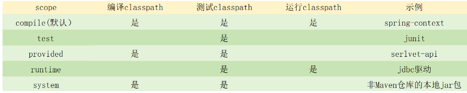 系统依赖范围,该依赖与3中classpath的关系,和provided依赖范围完全一致。但是,使用system范围的依赖时必须通过systemPath元素显示第指定依赖文件的路径。这种依赖直接依赖于本地路径中的构件(jar包),可能每个开发者机器中构件的路径不一致,所以如果使用这种写法,机器中可能没有问题,别人的机器中就会有问题,所以建议谨慎使用。