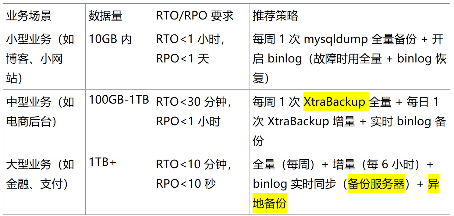 生产环境中,单一备份类型无法满足 "低 RTO + 低 RPO" 需求,需组合使用 "全量备份打基础、增量备份减体积、binlog 日志补间隙" 的三层策略,具体设计如下: