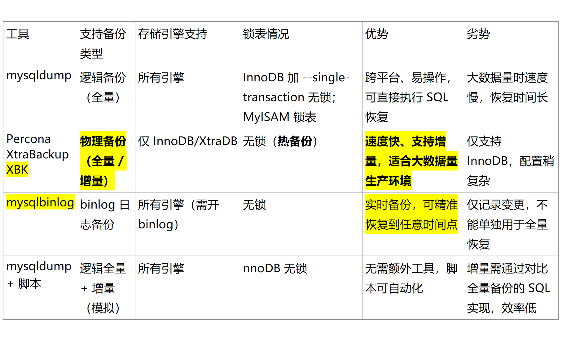 仅推荐 Percona XtraBackup(支持增量备份,通过对比全量备份的 LSN 日志序列号,识别变更数据)。
