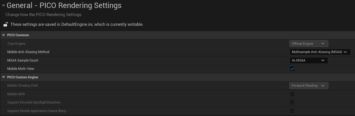 | 渲染 | 注视点渲染 | 注视点渲染 | 支持静态注视点渲染和眼动追踪注视点渲染,将视野中心区域以高分辨进行渲染,周边区域以低分辨率渲染,从而减轻 GPU 负担。 FFR 和 ETFR。UE5.4及以上支持FFR,PICO-XR引擎分支支持ETFR。 FFR:Pico Neo3系列、Pico4系列 ETFR:Pico Neo3 Pro Eye、Pico4P、Pico4E (仅支持搭载眼动追踪摄像头的 PICO 设备) 下采样Subsampled Layout:Pico Neo3系列、Pico4系列 |