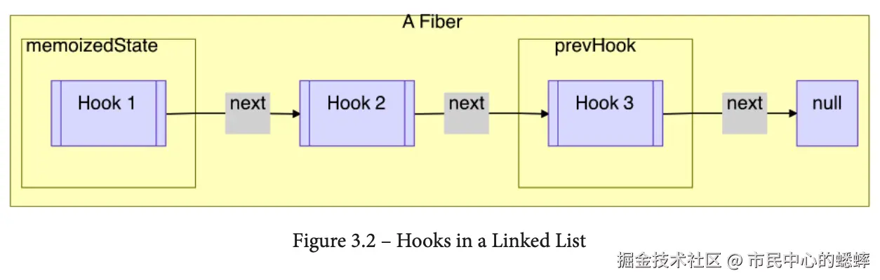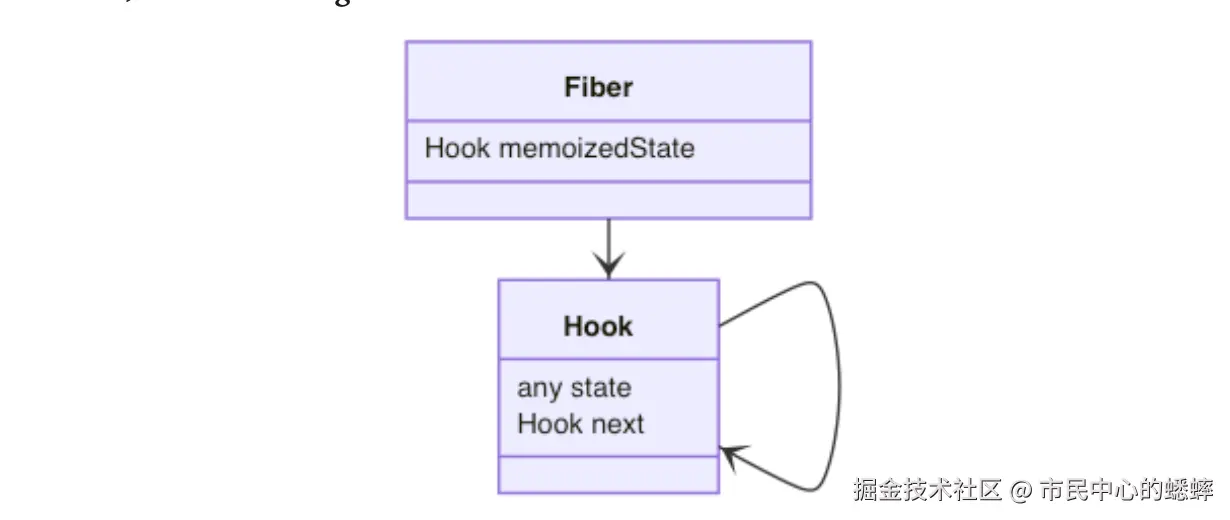 属性来存储当个状态。React不再是将多个状态存放在一个数组(或对象)中,而是通过链表(linked list)将这些状态相互关联起来,如下图。一个 Hook
