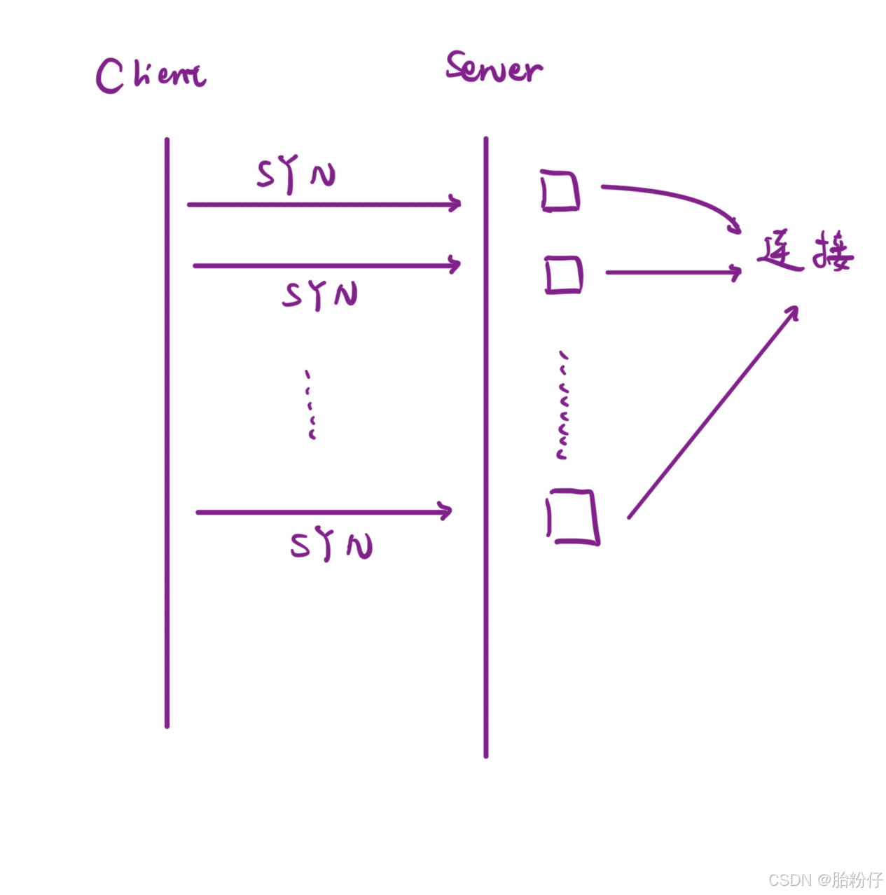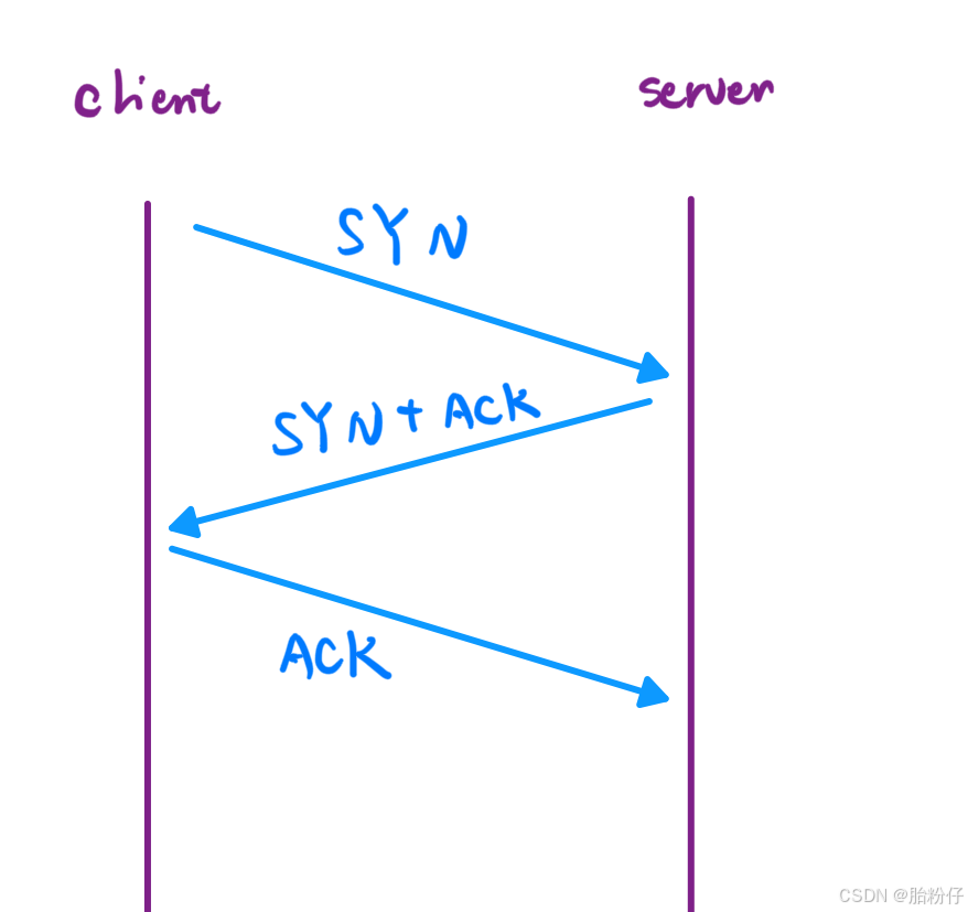 我们可以从 1 次握手开始研究。当 TCP 只要一次握手就可以建立连接时,就会产生一个问题。即使客户端已经内存不足,无法建立连接了;但就算客户端什么都不做,就只发 SYN,只要客户端每发一次 SYN,服务器就会直接新建一个连接。而当客户端发起很多次 SYN 后,服务器就会建立很多个多余的连接,进而就会导致服务器内存很容易就会被用完(这个现象称为"SYN洪水")。