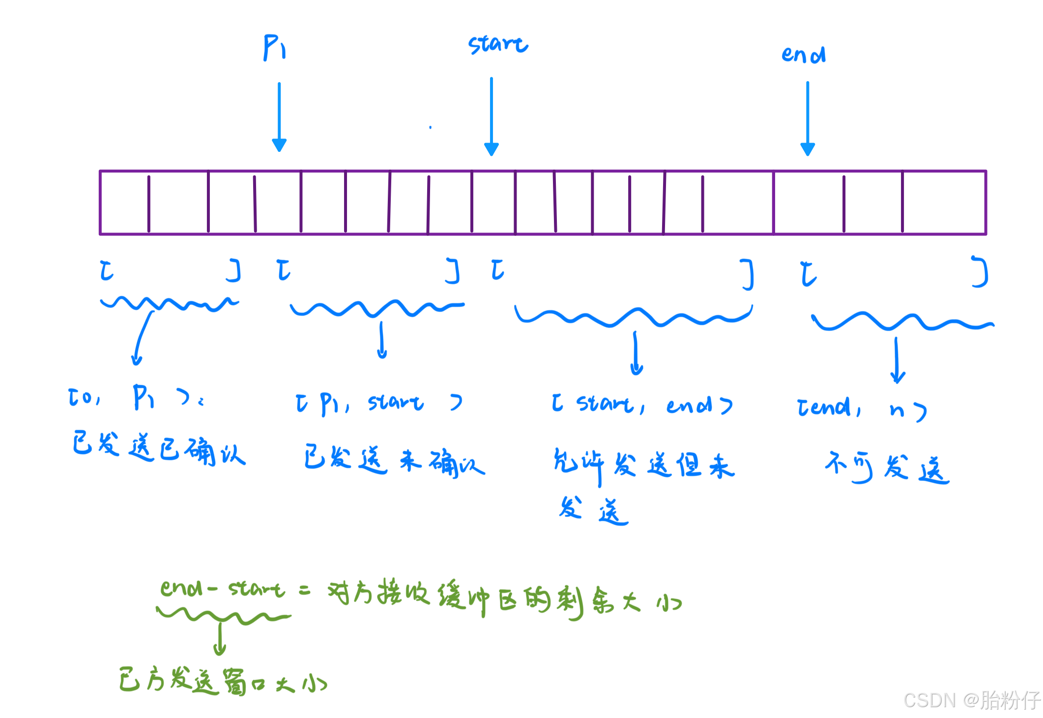 因为 TCP 保证了数据传输的可靠性,因此面对数据在网络中的丢包问题,TCP 的发送缓冲区必须保存数据一段时间,一旦数据丢失了,就要重发这个数据。因此,TCP 的发送缓冲区中的数据总共有 4 种状态:已发送已确认、已发送未确认、允许发送但未确认、不允许发送。而为了给数据分成 4 类,TCP 用 3 个指针把发送缓冲区分成 4 个区间。