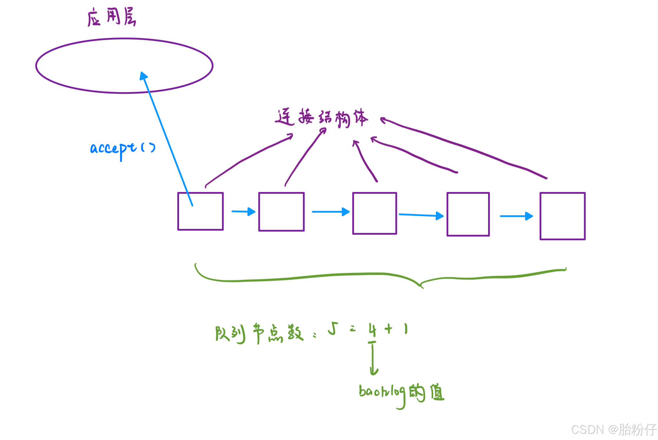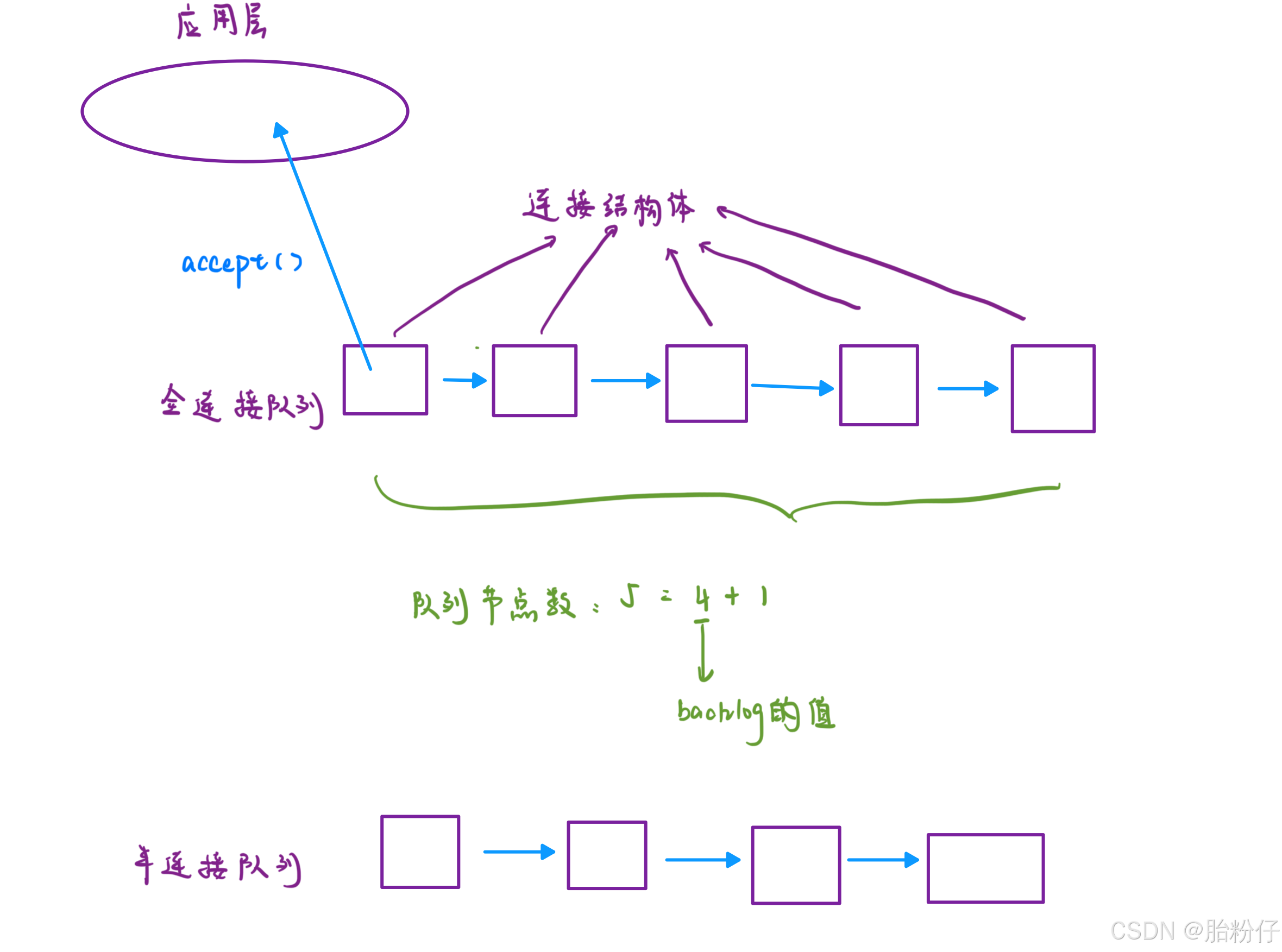 处于 established 状态的连接就是全连接。 对于处于全连接状态的连接,服务器会给这些连接用链表维护起来;然后这些连接就等着被 accept 函数拿到应用层。因此我们可以得出:连接的形成只是操作系统内核的事情,与 accept 函数无关, accept 函数只是用来把连接拿到应用层的工具罢了;也就是说,就算我们在代码中不调用 accept 函数,客户端与服务器之间照样能够建立 TCP 连接。 但我们知道,全连接队列的节点数是不可能无限多的,肯定会有个限度,而这个限度就是 listen 函数的 。所以,全连接队列的最大长度就等于