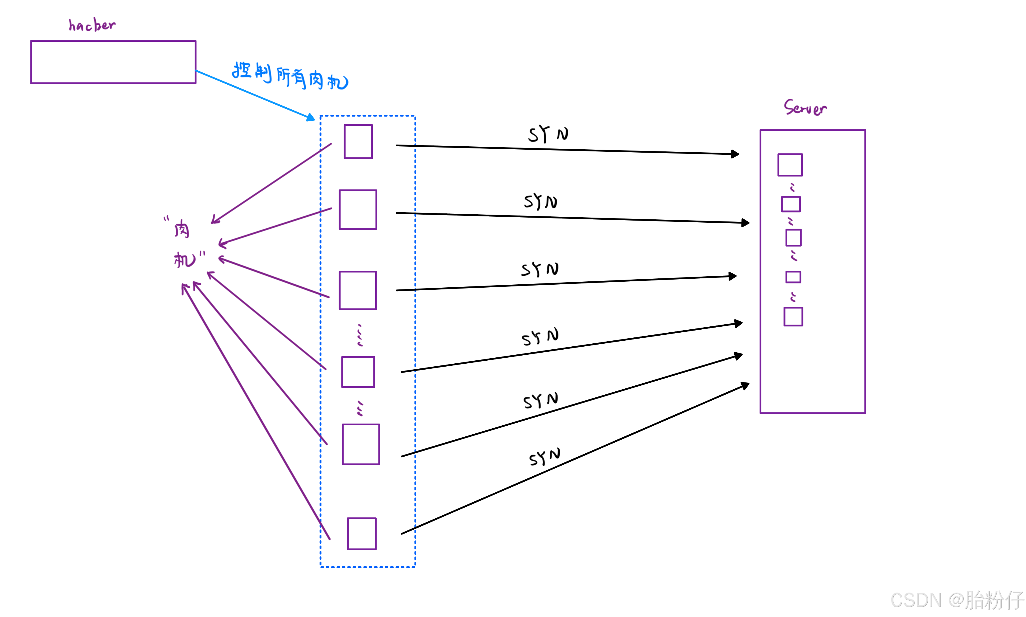 但是采用三握手就一定安全了吗?其实不是的。如果一个黑客用一台电脑去控制其他多台电脑,让其他多台电脑称为那一台电脑的"傀儡"。然后黑客就可以用一台电脑给这些"傀儡"发任务,让这些"傀儡"不断地给服务器发 SYN,建立连接,那么只要"傀儡"的数量足够多,发出的 SYN 足够多,那么就会让服务器建立很多的连接,最后导致服务器瘫痪。而这些"傀儡"电脑就叫"肉机"。