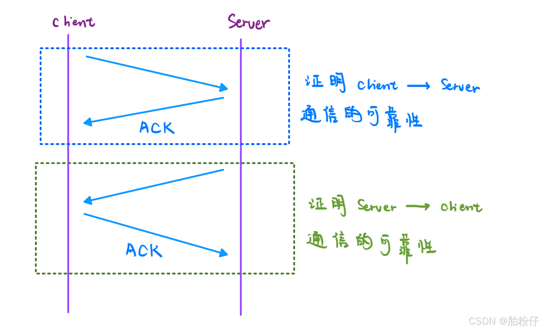 只要验证双向可传输即可,ACK 报文不用回应。因为 TCP 协议的目的就是为了双向传输的可靠性,所以只要验证双向可以通信就行了,并不用对是否收到 ACK 的问题作出回应。