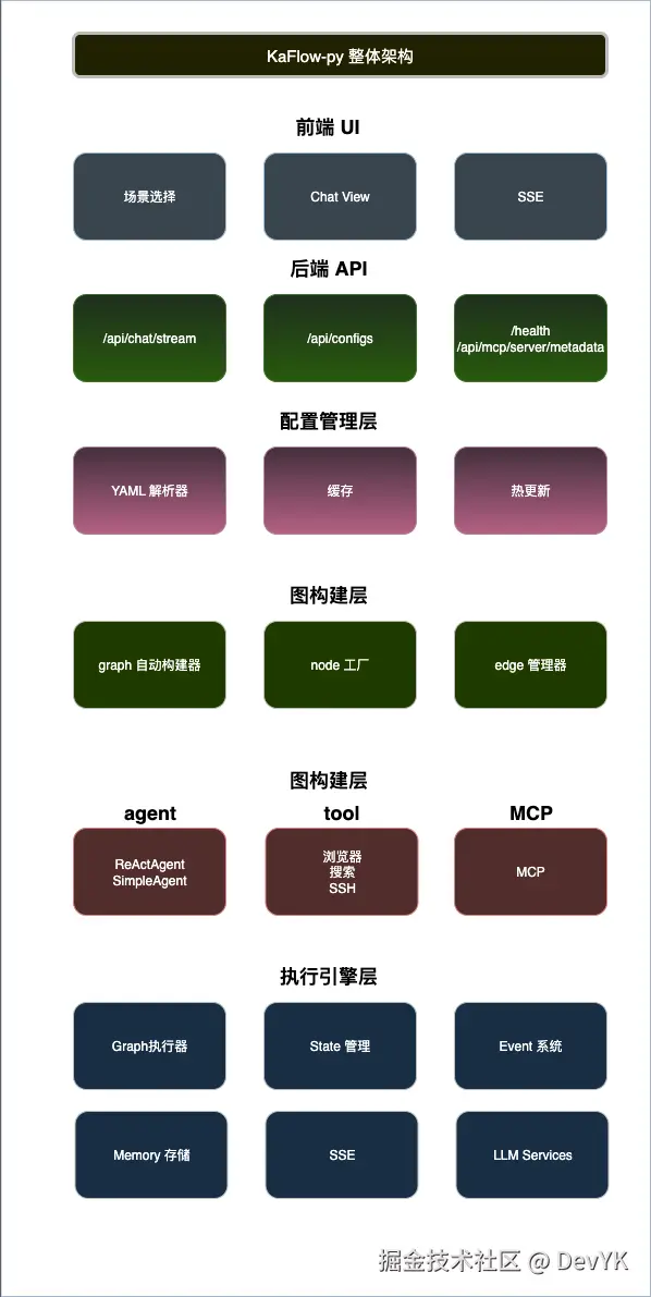 KaFlow-Py 就是为了解决这个问题而生的。它是一个配置驱动的 AI Agent 开发框架,让你通过 YAML 配置文件就能构建复杂的 AI 工作流。
