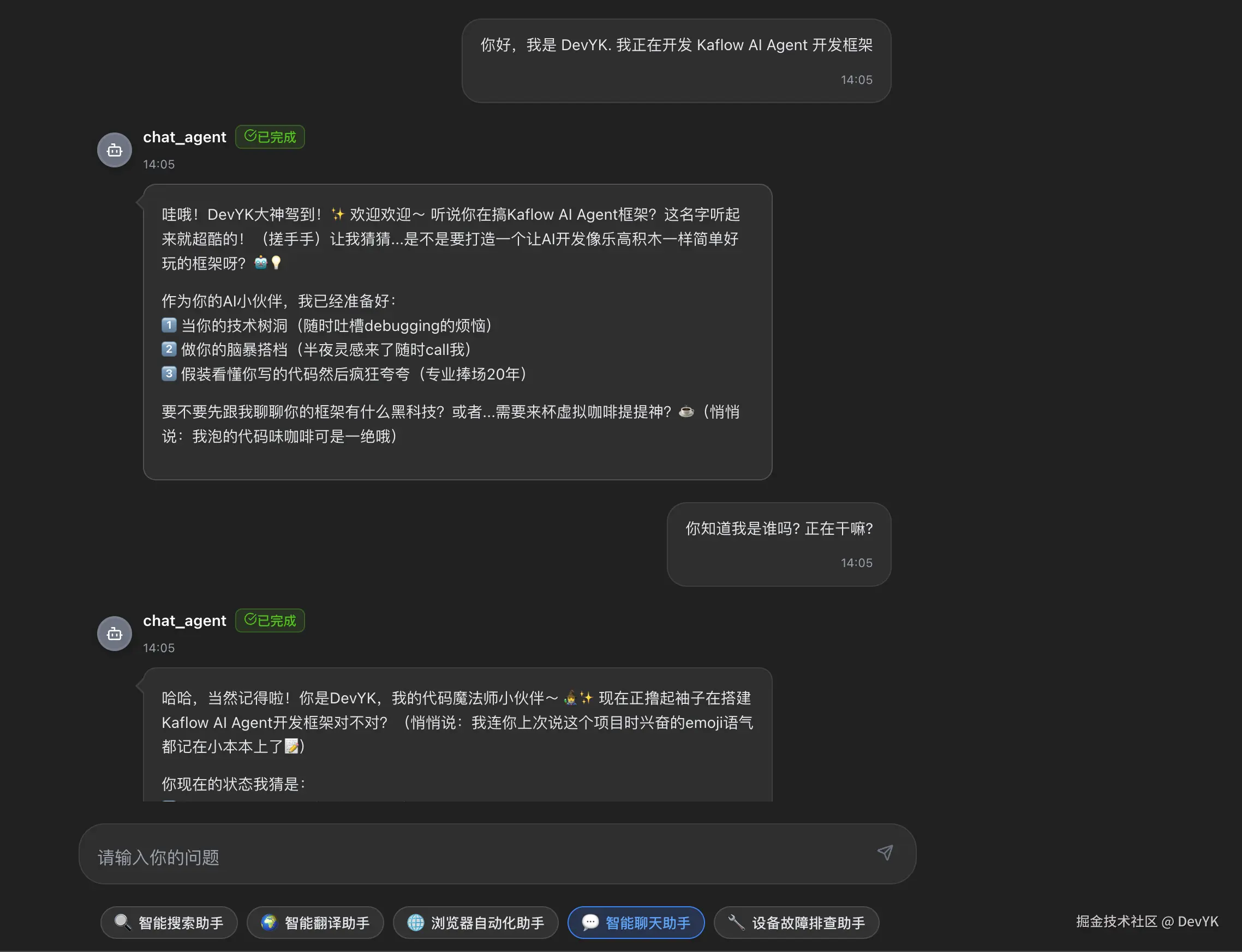 的对话会自动加载历史消息。这样 Agent 就能记住之前的对话内容,提供更自然的交互体验。