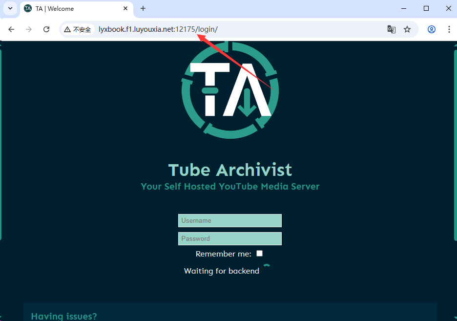 12,在外网电脑上,打开浏览器,在地址栏输入从路由侠生成的外网地址,就可以看到内网部署的 TubeArchivist 登录界面了。