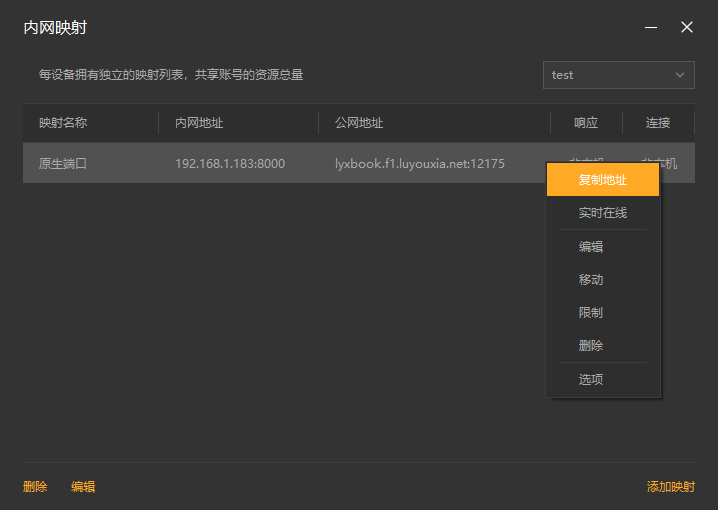 11,创建好后,就可以看到一条映射的公网地址,鼠标右键点击【复制地址】。
