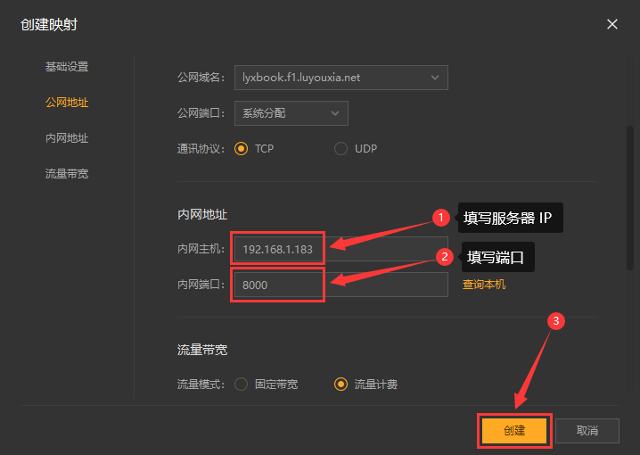 10,在内网地址填写你的服务器 IP 和 TubeArchivist 端口 8000 后点击【创建】按钮,如下图。