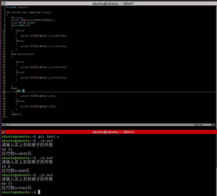 - 编写程序实现:服装店经营套服,也单件出售,若买的不少于50套,每套80元;不足50套的每套90元;只买上衣每件60元;只买裤子每条45元。输入所买上衣c和裤子t的件数,计算应付款m。