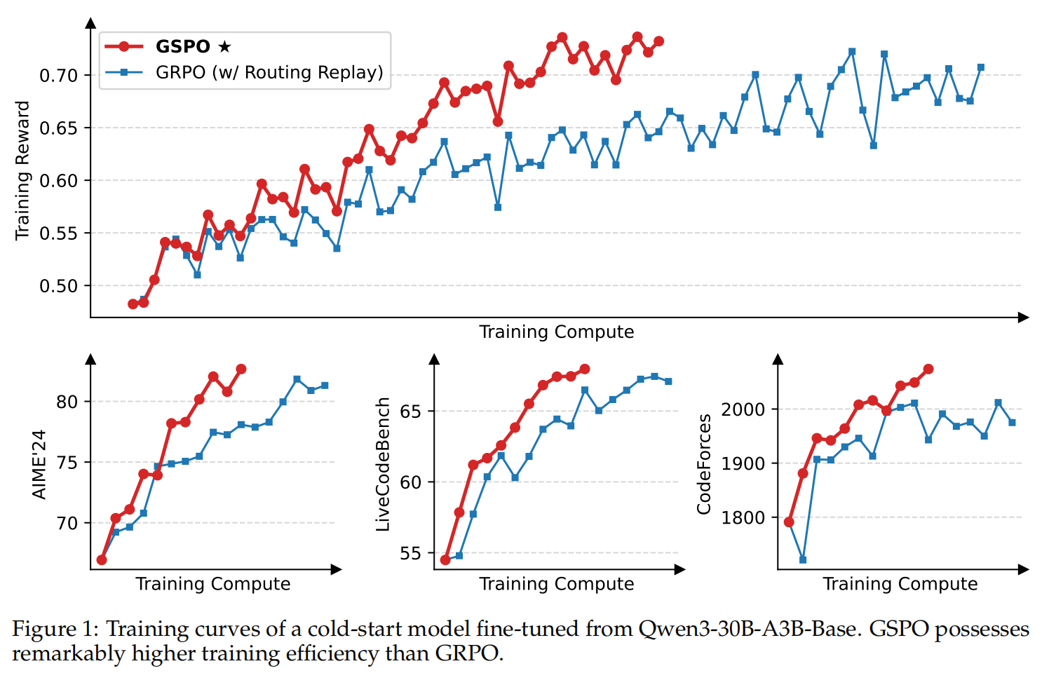 - 在相同训练计算资源时,GSPO比GRPO训练的模型效果更好