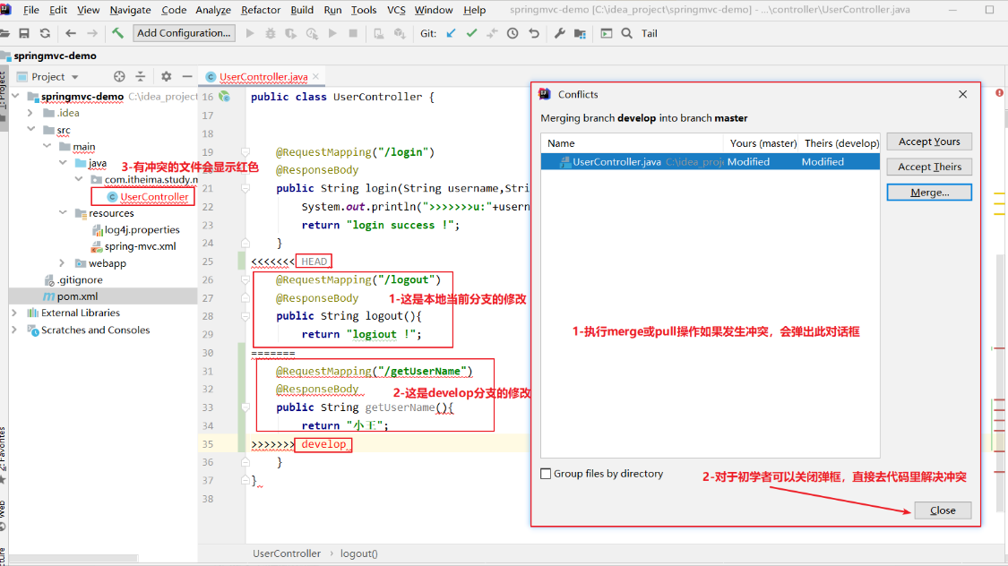 下面是我从其它地方找的参考图,拉取时发生的冲突,使用的idea版本可能有些低,界面有差别,不过思路都一样
