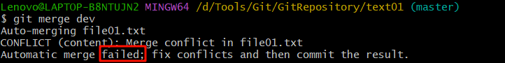 在B用户拉取代码时,因为A、B用户同一段时间修改了同一个文件的相同位置代码,故会发生合并冲突。