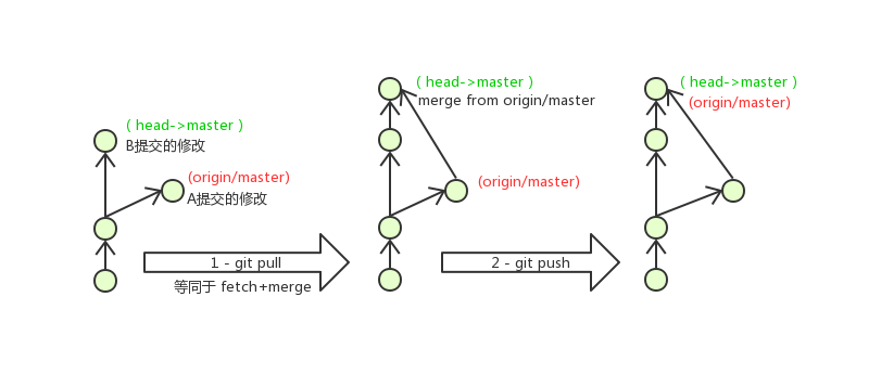 A用户在本地修改代码后优先推送到远程仓库,此时B用户在本地修改代码,提交到本地仓库后,也需要推送到远程仓库,此时B用户晚于A用户,故需要先拉取远程仓库的提交,经过合并后才能推送到远端分支,如下图所示。