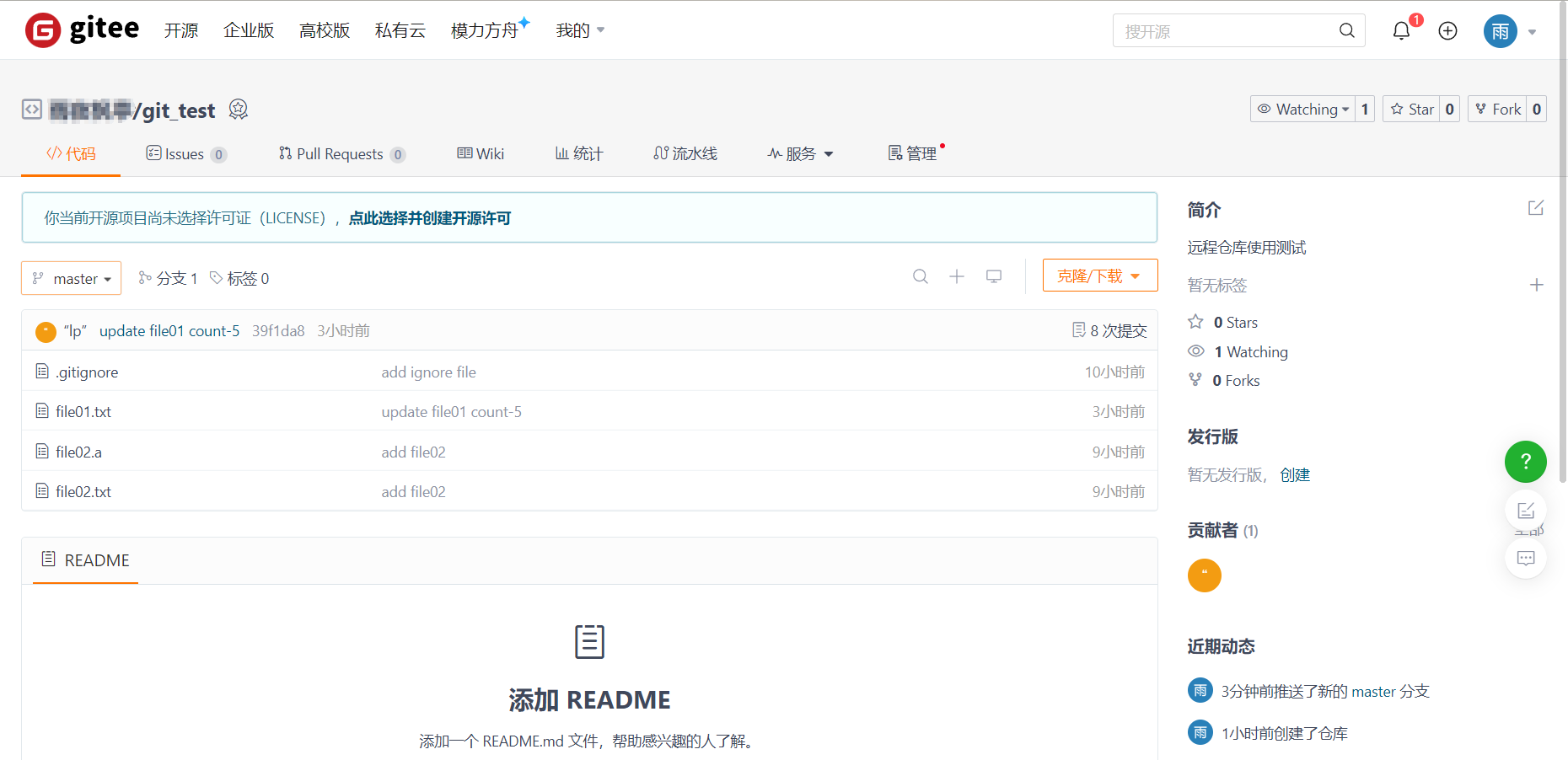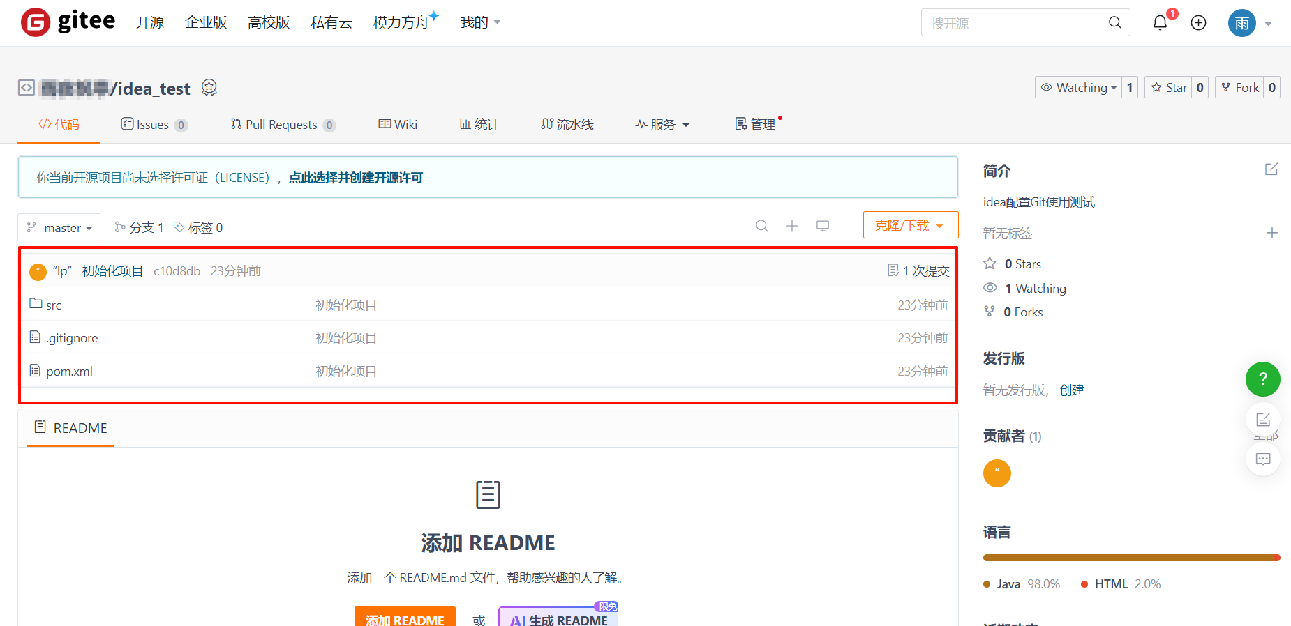 重新刷新或进入远程仓库页面会看到成功把项目推送到远程仓库