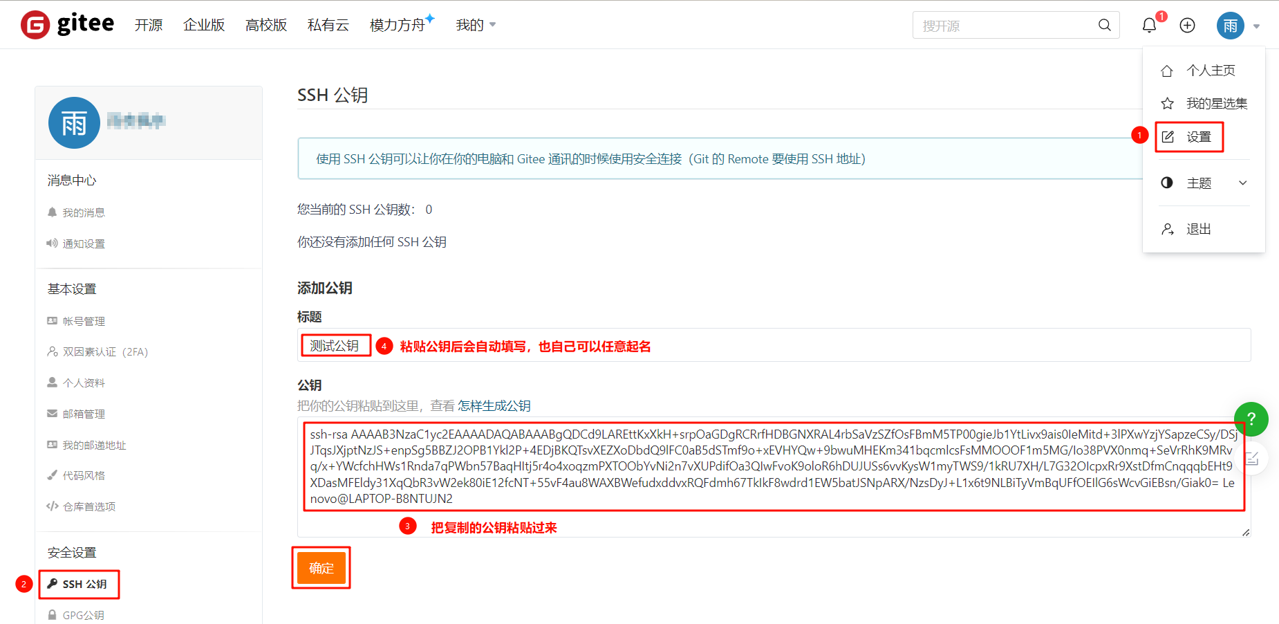 - Gitee设置账户共公钥