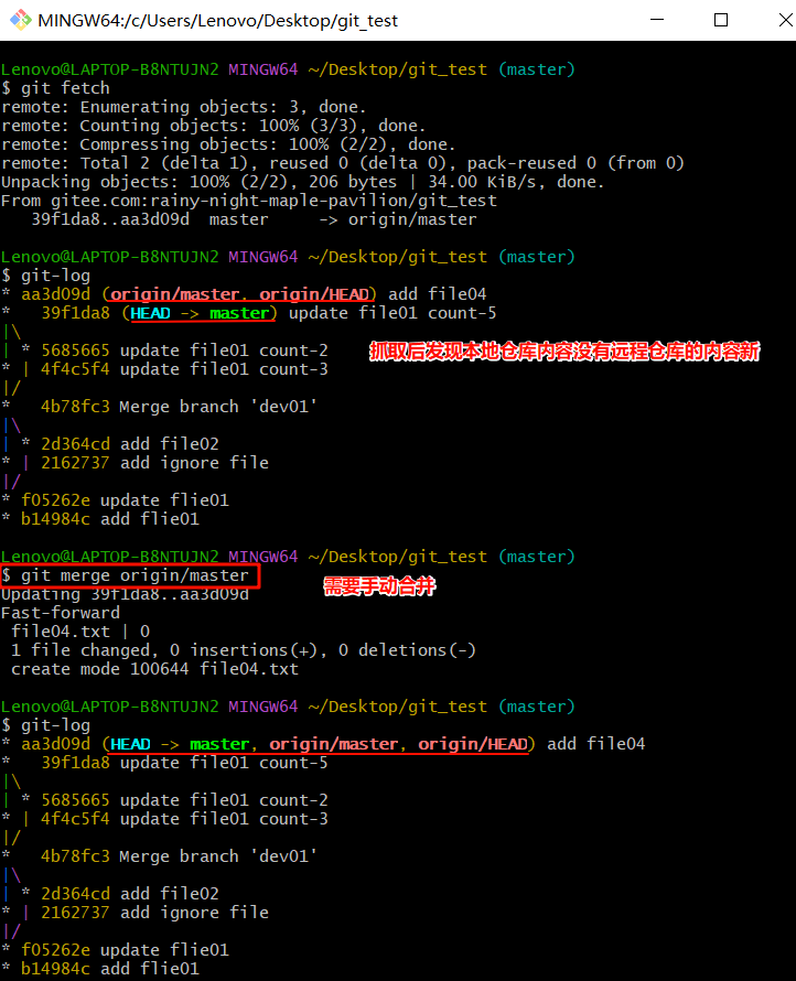 在前面从远程仓库克隆到桌面的本地仓库里面将远程仓库的代码抓取到该仓库,并手动合并