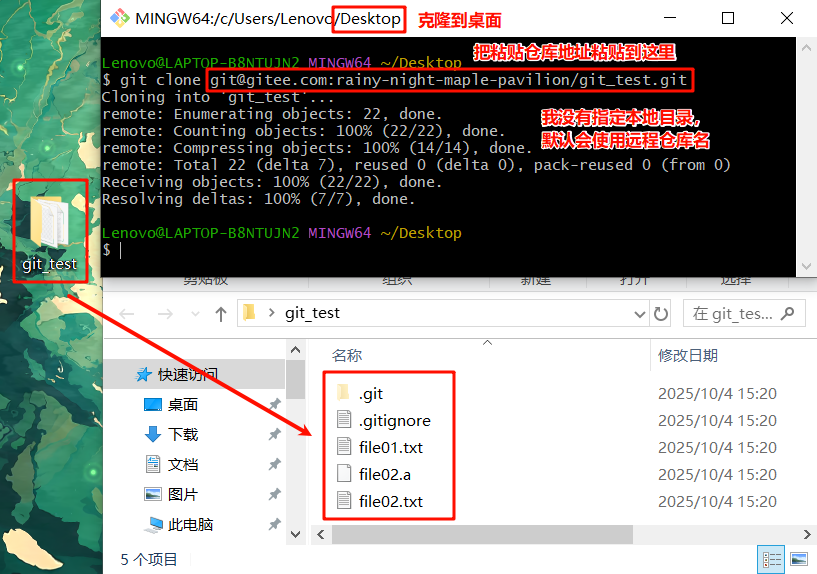 比如我这里把刚刚把推送到远程仓库的文件内容克隆到电脑桌面