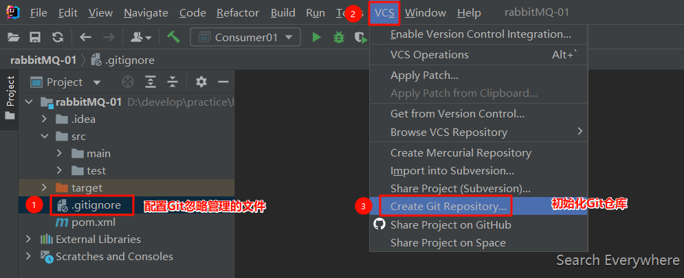 在项目中添加.gitignore(创建项目时一般都会自带,且自带一些配置,我这里就按自带的默认配置了),在里面配置不想要进行管理的内容