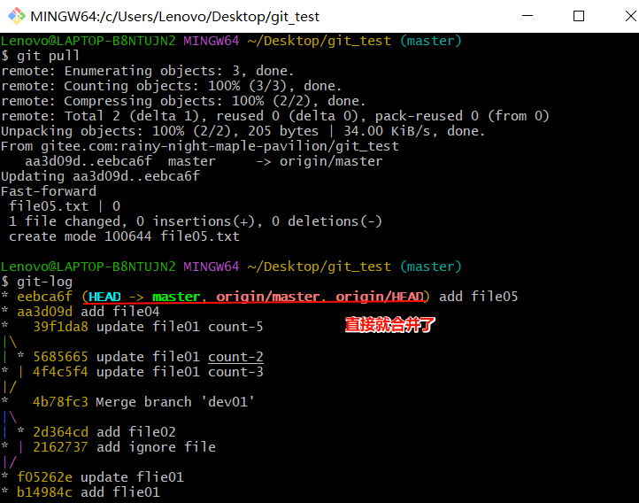 远程分支和本地的分支一样,我们可以进行merge操作,只是需要先把远端仓库里的更新都下载到本地,再进行操作。